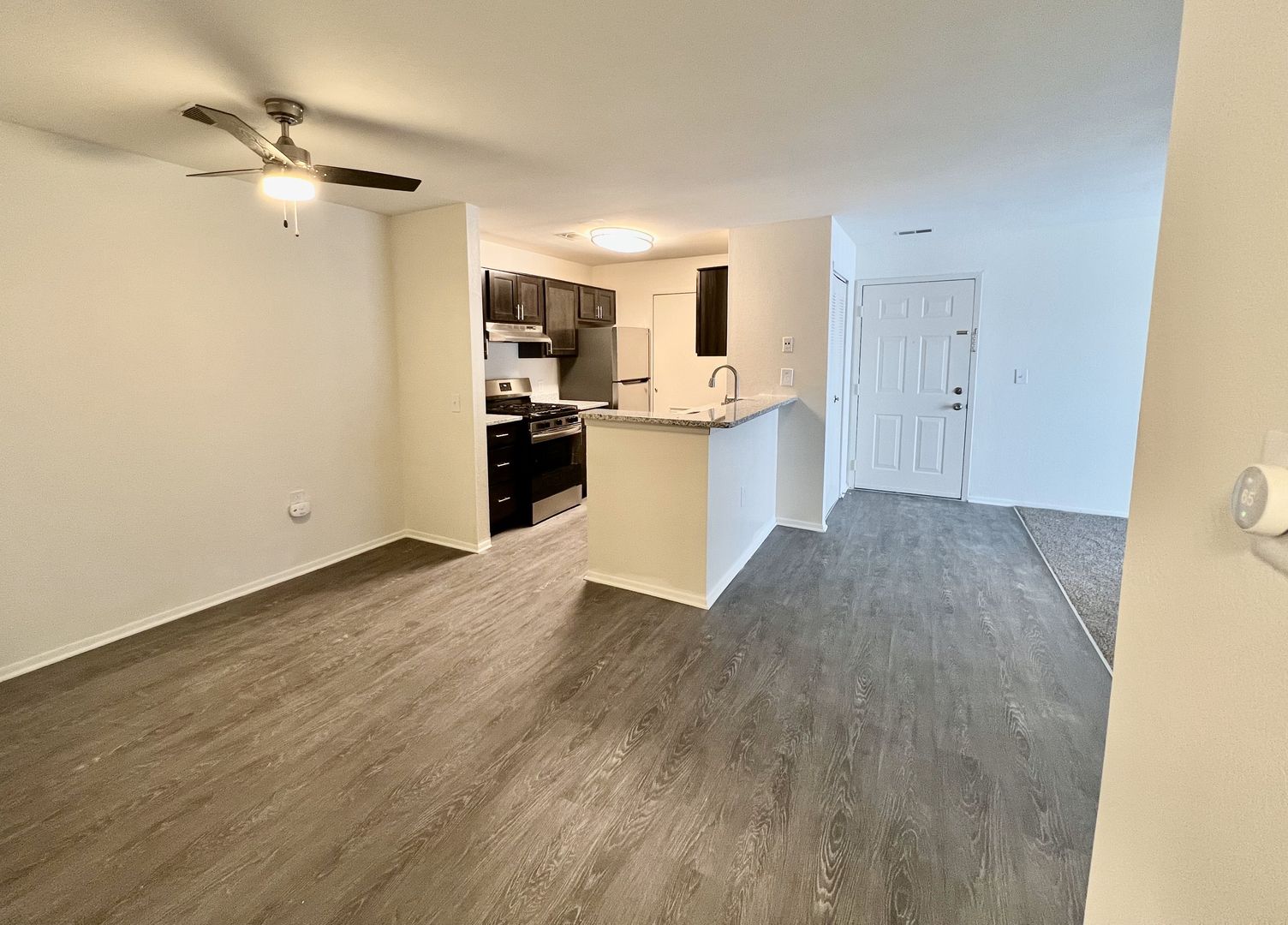Our newly renovated apartments feature stainless steel appliances, modern cabinetry, granite countertops, vinyl plank flooring, new plush carpet, and brushed nickel hardware.